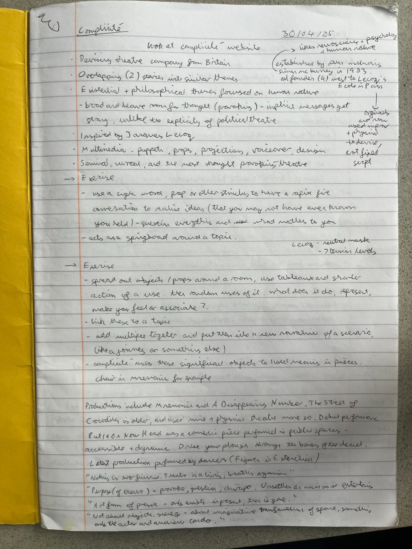 Complicite is a devising theatre company founded by four students of Jacques Lecoq's theatre school in Paris, including Simon McBurney. They largely use multimedia, physical theatre and lots of Lecoq's principles in their work. more notes at home. and add the slides from kirk